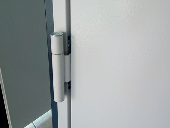 Cerniera a baionetta realizzata in acciaio stampato con scorrimento su boccole temperate antifrizione, con molla interna per l'autochiusura dell'anta. Avvitata al telaio e all'anta a mezzo viti invisibili a porta chiusa, registrabile. Verniciata in tinta Ral.