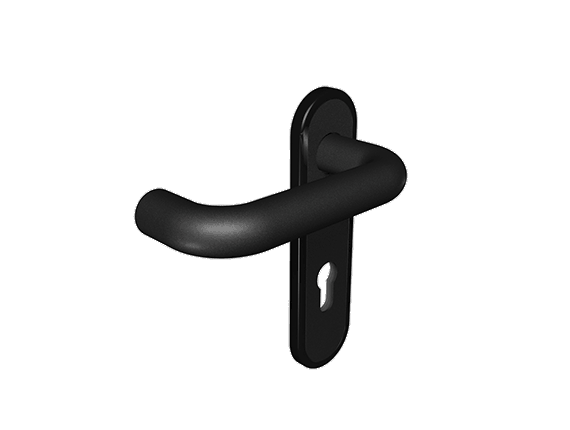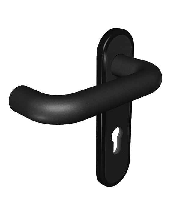 Dotazione di serie delle porte tagliafuoco Elite+ è la maniglia antinfortunistica in plastica nera con placca e foro per cilindro.