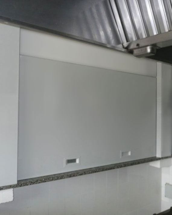 Guide laterali e traversa superiore scatolate, complete di guide di scorrimento, contrappeso, labirinti parafiamma di tenuta, ruote di scorrimento su cuscinetti a sfere per assicurare uno scorrimento dolce.