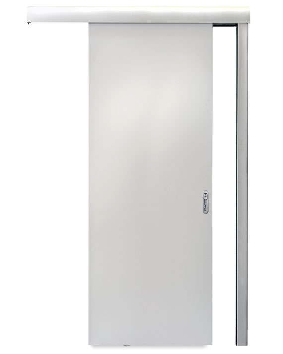 Anta scorrevole esternamente al muro lungo un binario orizzontale di scorrimento in alluminio estruso, nascosto alla vista mediante un carter asportabile, a sezione arrotondata e tagliato a 45°.