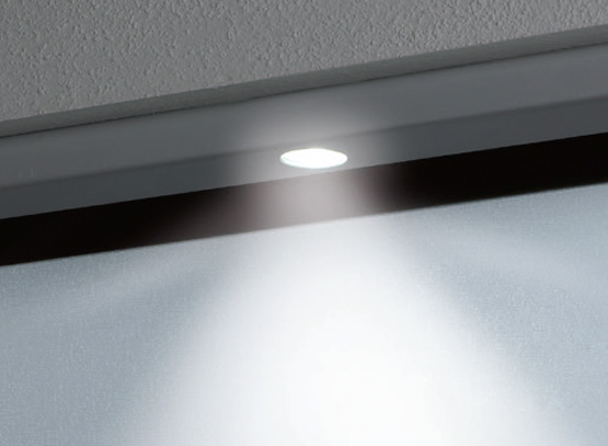 Плоският LED осветителен комплект в алуминиев цвят (40 x 20 мм) е монтиран под щурца на гаража, за да се спести място и да се запази почти цялата височина на гаража. LED осветлението с дълъг експлоатационен живот, осигурява много ярка светлина при минимална консумация на енергия. В зависимост от ширината на вратата, осветителната лента може лесно да се скъси от двете страни, за да се постигне точно симетрично осветяване на вратата.