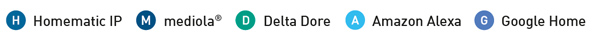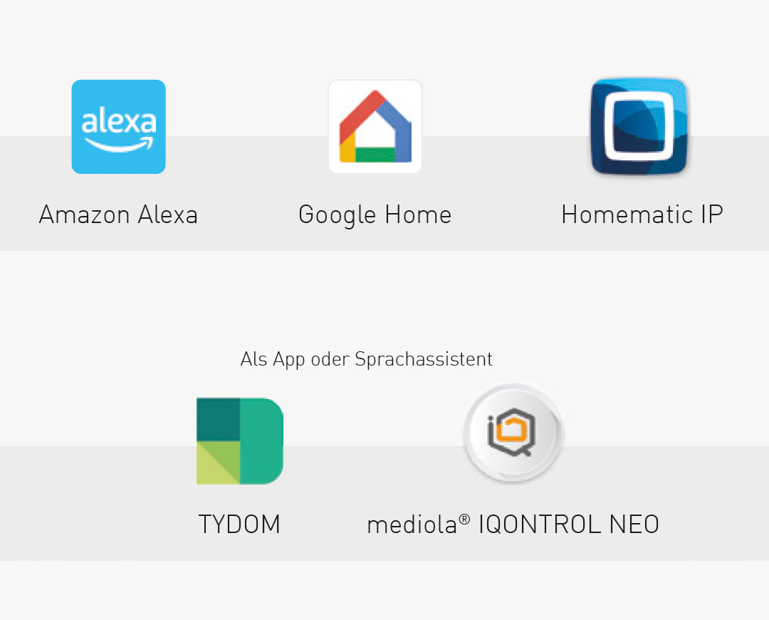 Приложението Homematic IP от eQ-3, приложението TYDOM от Delta Dore, IQControl Neo от mediola, Google Home и Amazon Alexa са достъпни безплатно от App Store или Google Play.