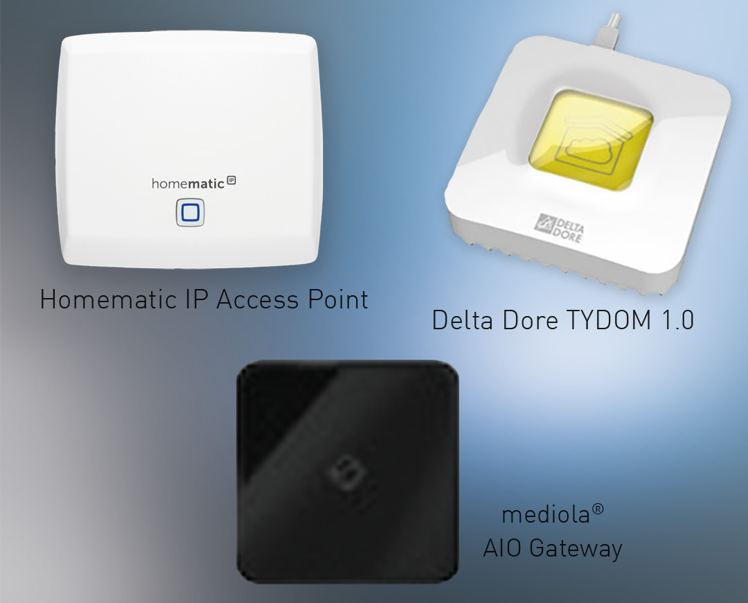 С универсалното решение Mediola®, устройствата (термостат за отопление, сензор за врата/прозорец ...) от широк кръг производители на SmartHome могат лесно да бъдат свързани в една SmartHome система, автоматизирана и управлявана с приложението Mediola®.