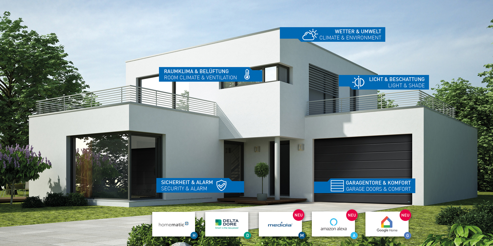 С помощта на системите Homematic IP и Delta Dore секционните гаражни врати на Novoferm са интелигентни от край време. Сега, с новата технология за свързване на Amazon Alexa, Google Home и Mediola®, предлагаме три допълнителни опции, които улесняват гласовото управление и интегрирането на вратата в съществуваща SmartHome система.