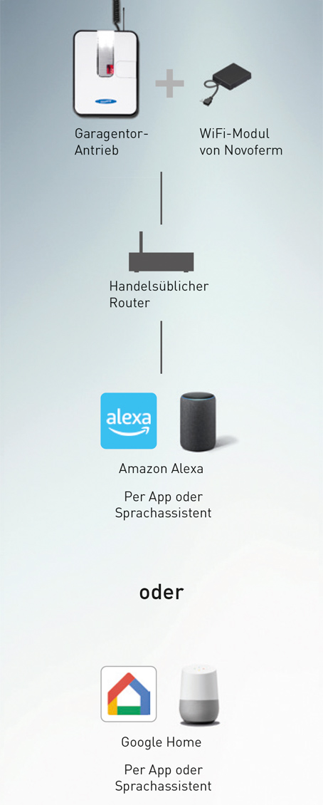 По този начин гаражните врати Novoferm просто стават част от света на Amazon Alexa или Google Home.