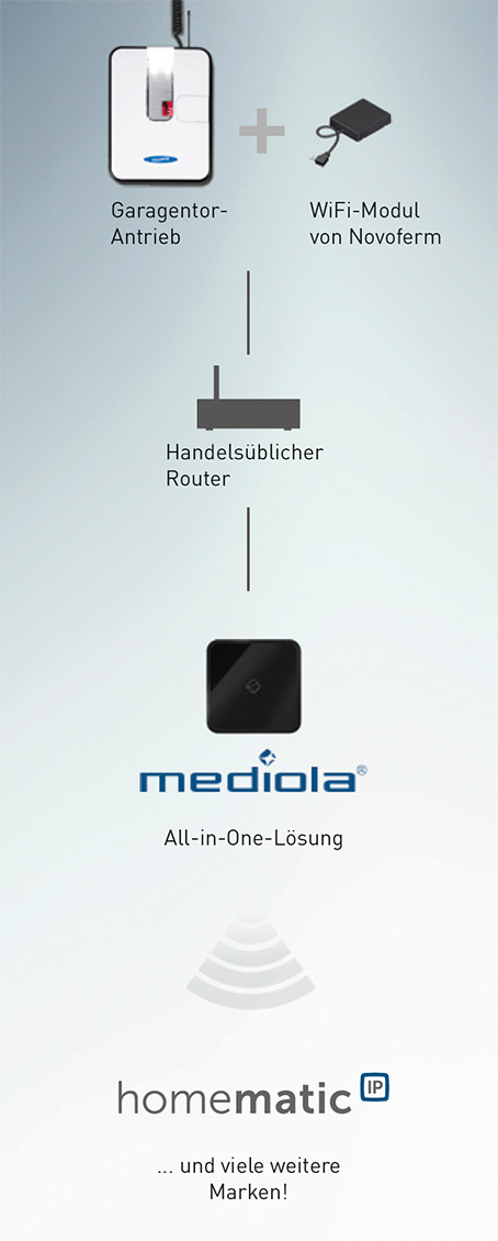 За да се интегрират секционните гаражни врати Novoferm в системата Mediola® SmartHome, Novoferm се нуждае само от новия модул Novoferm WiFi или модула Novoferm Homematic IP.