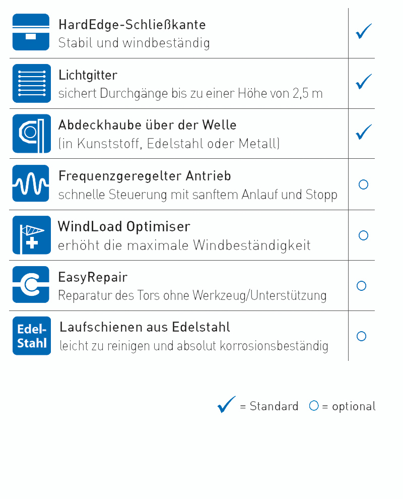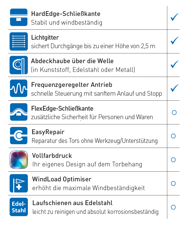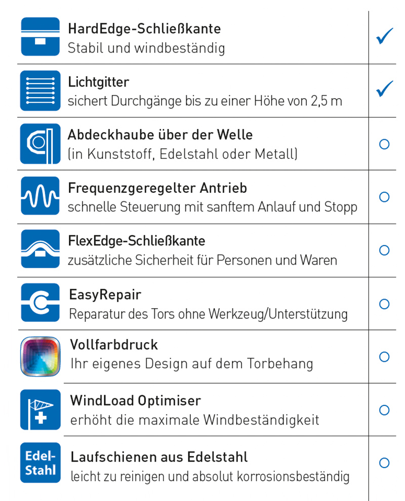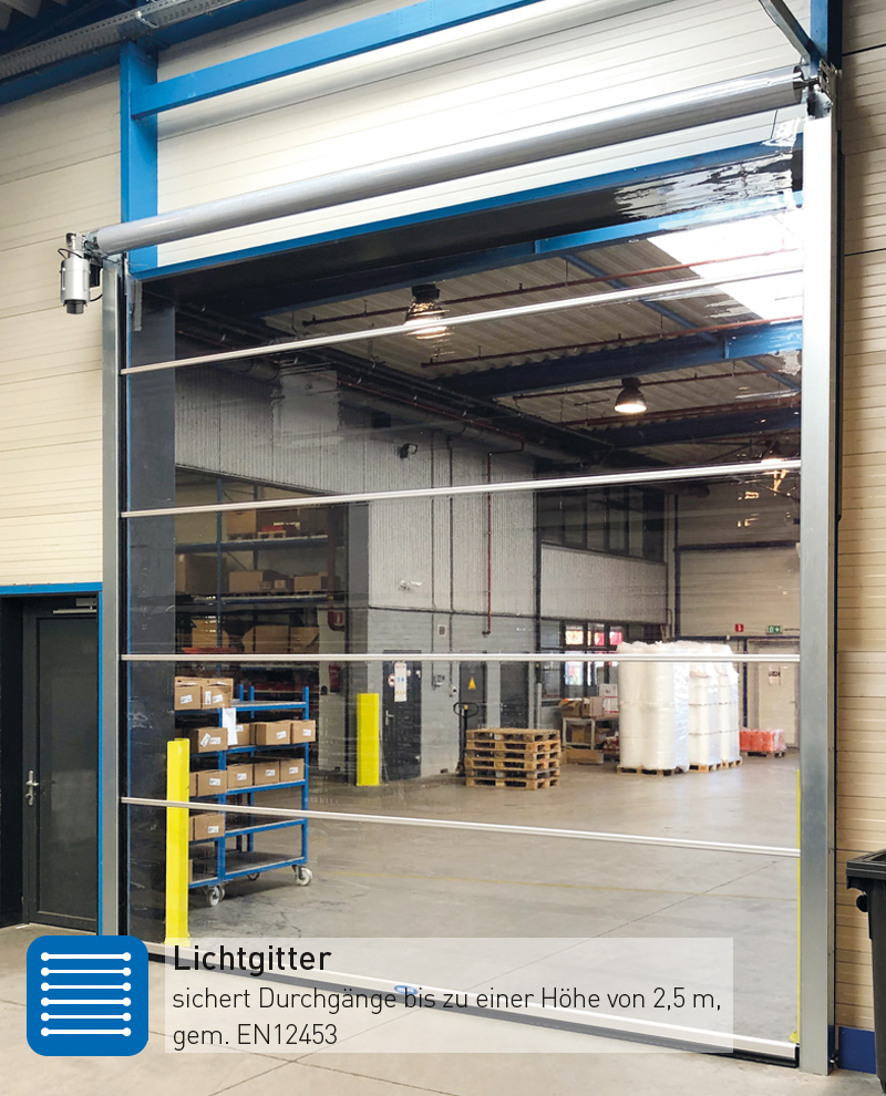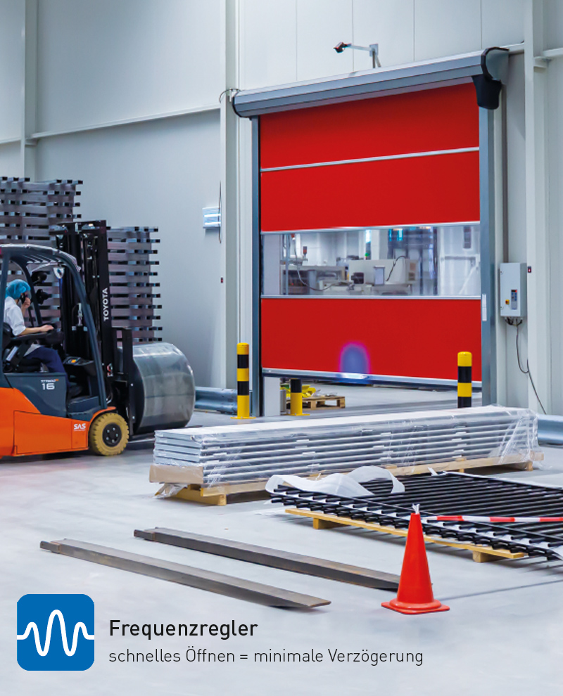Идеален за ежедневно преминаване на хора и леки товари. Укрепващите профили осигуряват допълнителна стабилност. Скоростта на отваряне от 1,8 m/s прави тази врата практична дори при интензивен трафик. Полезна е за производствени процеси, които протичат бързо и при които не се допускат престои. Тази иновативна врата има много широк спектър на приложение.