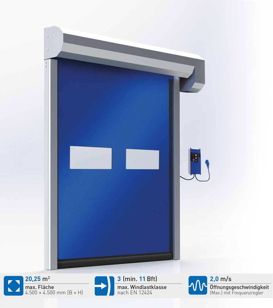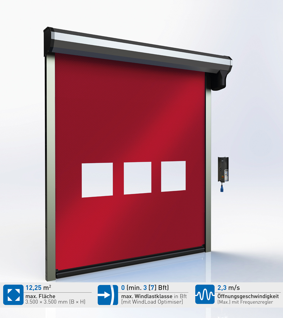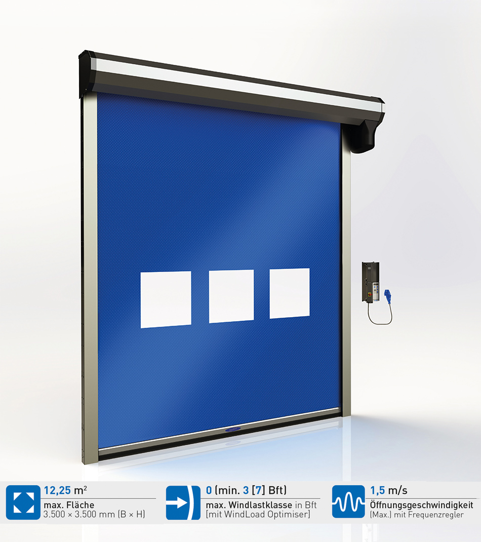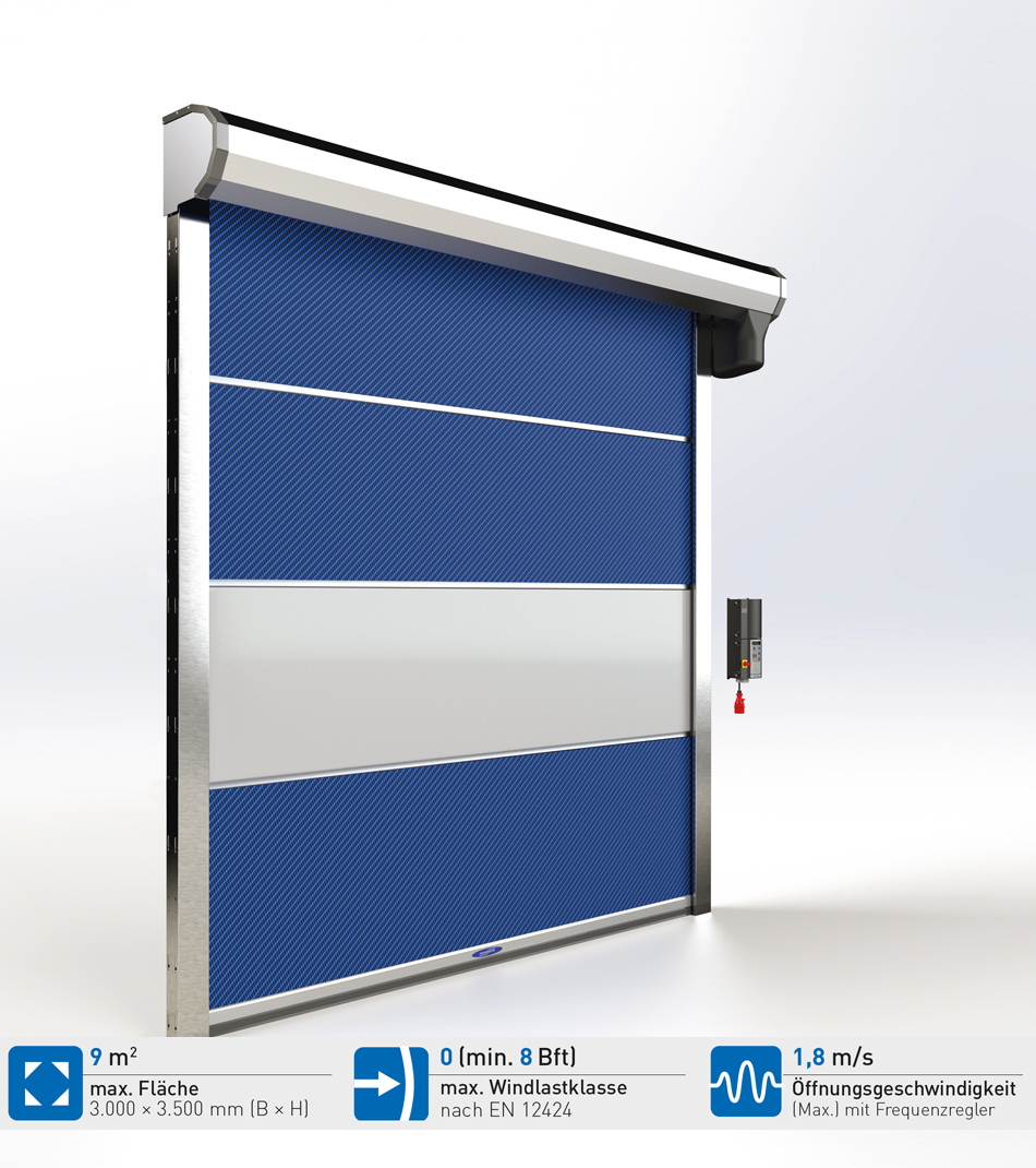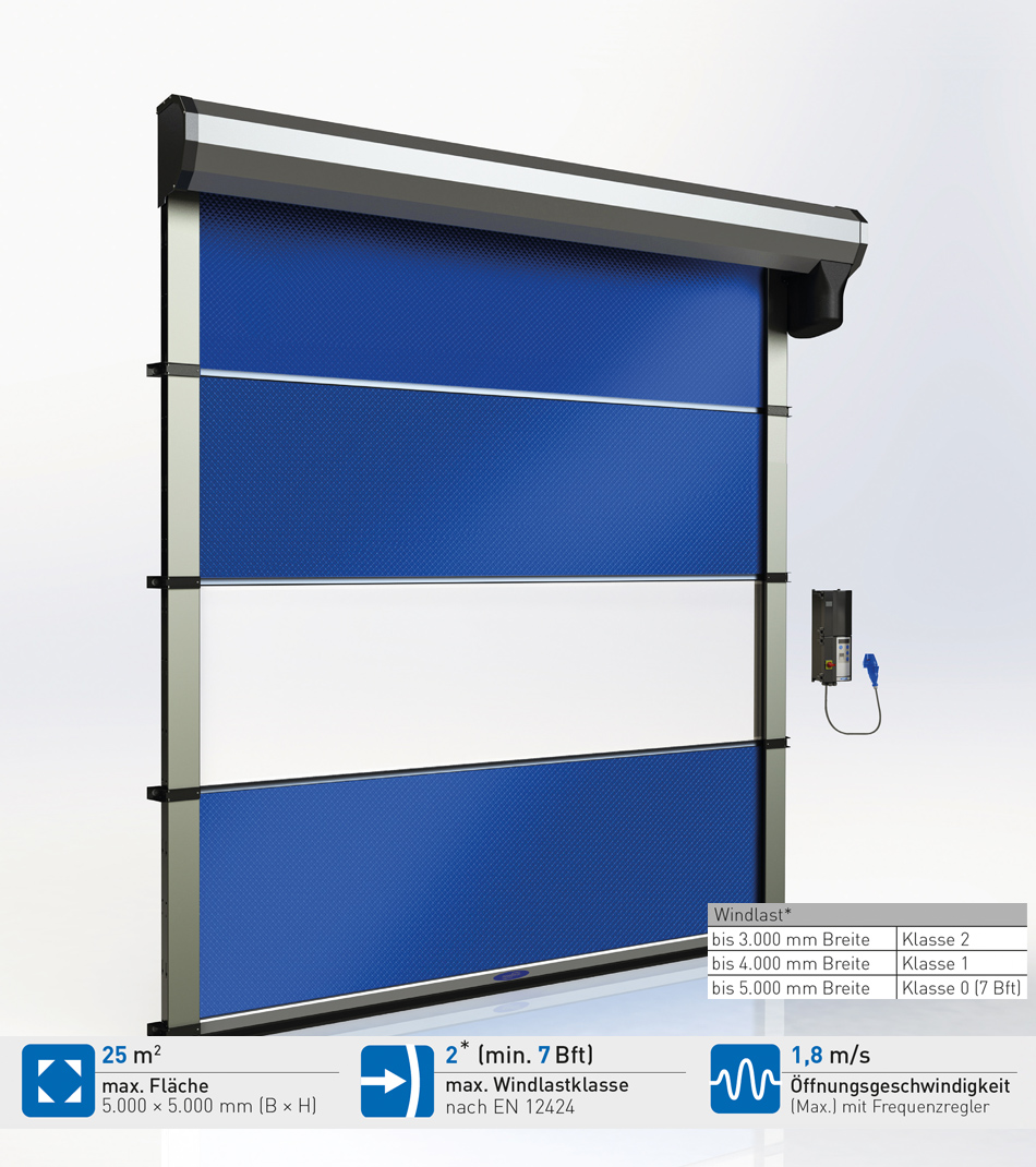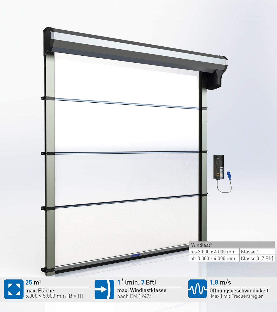 БЪРЗОРОЛЕТНАТА ВРАТА STRONG-E е добро решение за отвори до 9 m2 с умерен натиск на вятъра.