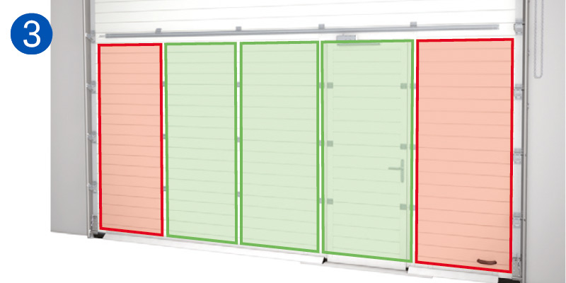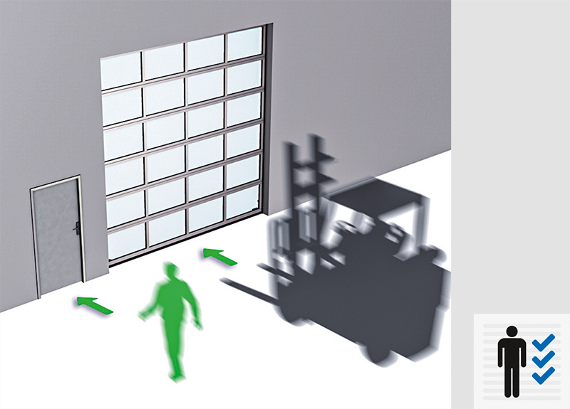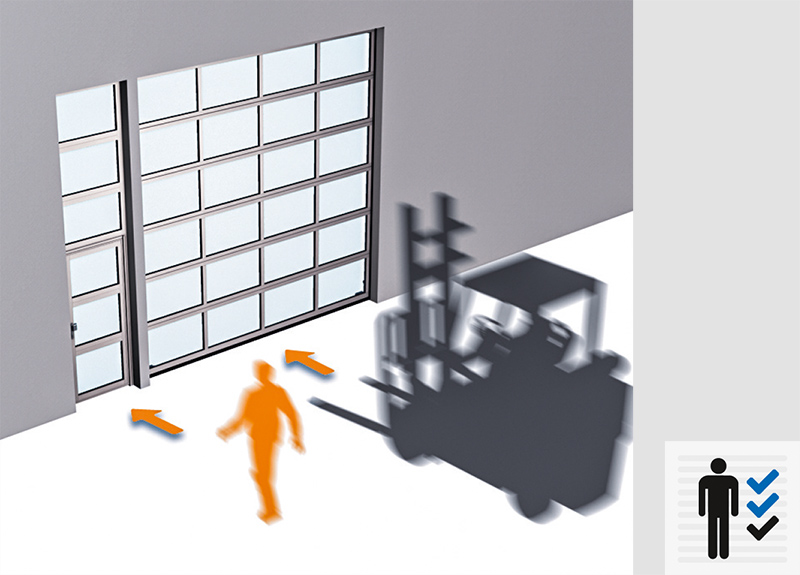 С цел предотвратяване на злополуки препоръчваме, когато е възможно, пешеходният трафик и трафикът на стоки да сa разделени. Това е възможно с вградена проходна врата във фасадата на сградата, отваряща се независимо от секционната врата, или съседна врата, разположена непосредствено до секционната врата. Макар че допълнителните врати могат да бъдат вградени в секционните, те не допринасят за стабилността на конструкцията. Още повече, че се прилагат ограничения по отношение на широчината и височината, както и височината на прага на допълнителната проходна врата, които могат да доведат до несъвместимост с приложимите закони и разпоредби, регулиращи аварийните изходи.