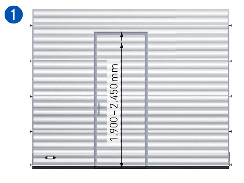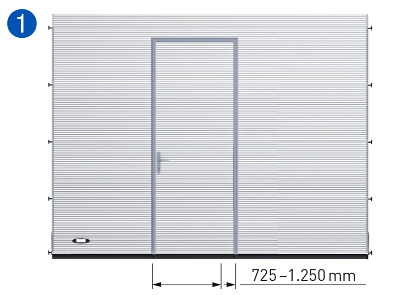 Секционната врата винаги се монтира зад отвора. Така че, ако сте избрали да поставите съседната врата от същата страна на сградата, препоръчваме Ви също да я монтирате зад отвора. Ползите за Вас са две: и двете врати лежат в една и съща равнина, а широчината на светлия проход на съседната врата е 810 мм, ако широчината на строителния отвор е 1000 мм. Така се добавя и ширина от 60 мм в сравнение с монтаж в строителния отвор. Ако изберете монтаж в отвора, повърхностите на вратите няма да лежат в една и съща равнина и широчината на проходния отвор ще бъде само 750 мм при същата широчина на строителния отвор.