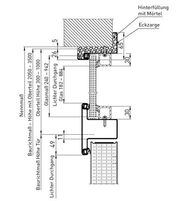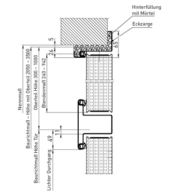 | ¹) Горните панели за врати с допълнителна димозащита се предлагат само до макс. ширина BRM 1250 мм за еднокрили врати. В комбинация с димозащита са одобрени само за монтаж в плътни стени (зидария/бетон/газобетон). |