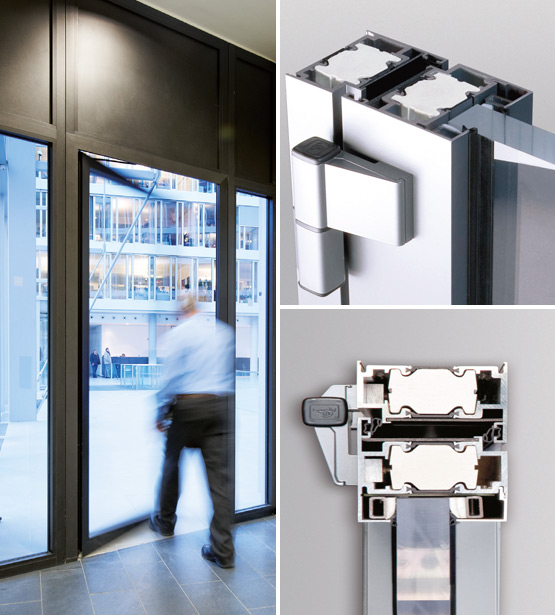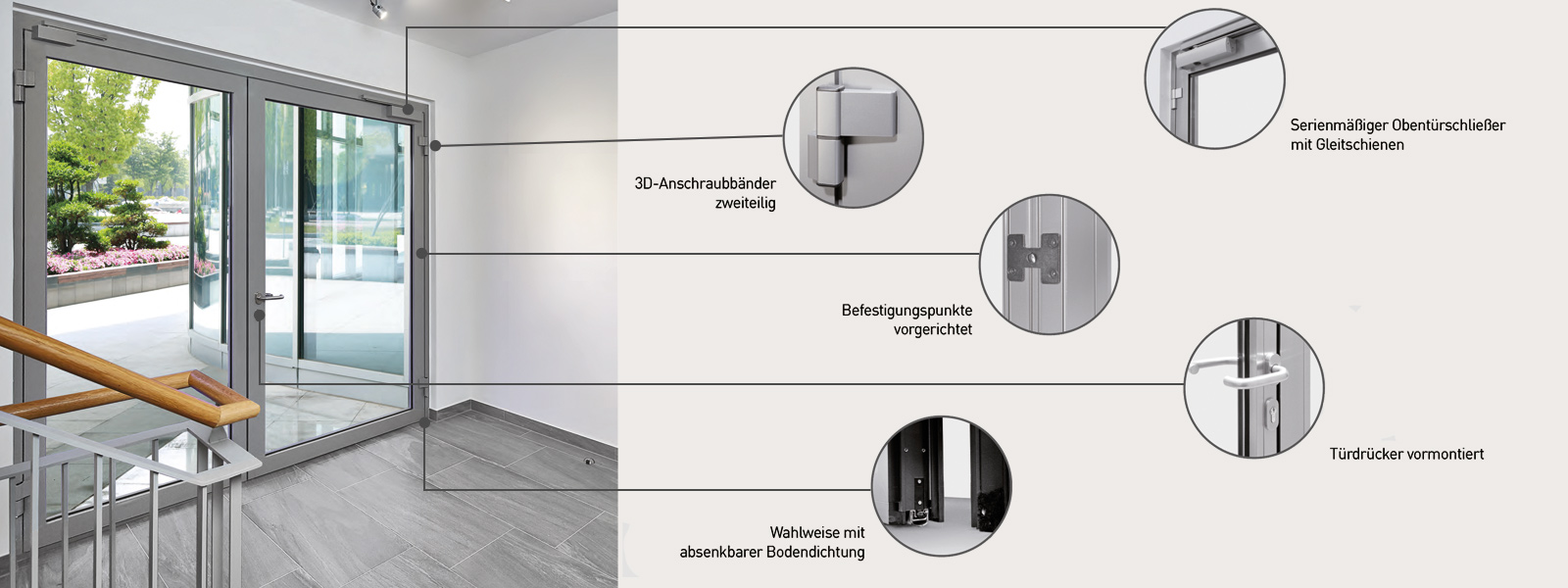 Многоточково заключване, подготвено за патрон, лостова дръжка или сменяем обков с овална розетка от алуминий, неръждаема стомана или PVC-U. Стандартно пасивното крило се държи от горния автомат, алтернативно е възможна антипаник функция в съответствие с DIN EN 179 или DIN EN 1125