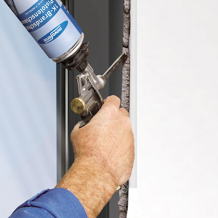 С противопожарната пяна Novoferm профилите и касите в металните конструкции и конструкциите от гипсокартон могат да се запълват много по-бързо и чисто. Обичайните предварителни познания за монтаж на противопожарни врати са напълно достатъчни. Документирането на съответстващия на изискванията за одобрение монтаж е изключително лесно. За тази цел върху кутията с пяна има лесно свалящи се самозалепващи се етикети 1, които просто се залепват върху потвърждението за съответствие 2 и съдържат цялата необходима информация.
