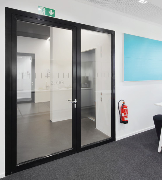 Вратата от рамкови профили NovoFire® се предлага с едни и същи покрития, за да изглежда добре в цялата сграда.