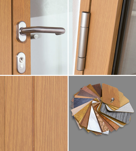 Анодиран алуминий, с визия на неръждаема стомана, прахово боядисан в дървесен декор, цветове NCS