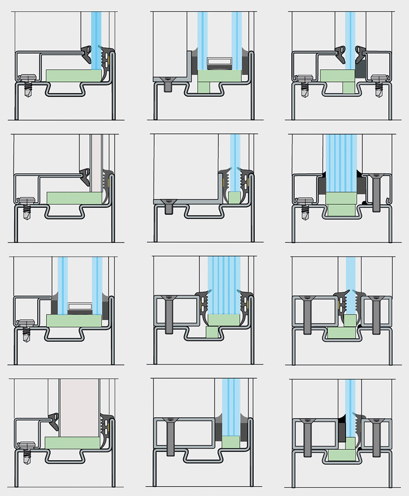По отношение на технологията на остъкляване са възможни както сухо стъкло (черно EPDM уплътнение от външната страна), така и мокро стъкло (със самозалепващо се уплътнение).