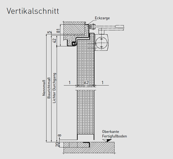 1-крилите врати са стандартно оборудвани с вътрешна армировка за автомат от страната на пантите. Размер > 1000 x 2125 mm (светъл проходен размер > 916 x 2083 mm) в стандартна версия с горен автомат Geze TS 4000 F или dormakaba TS 80 F при поискване се предлага на същата цена и с горен автомат с плъзгаща се шина Novoferm NFGS 55)