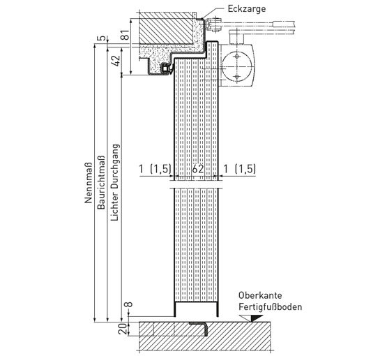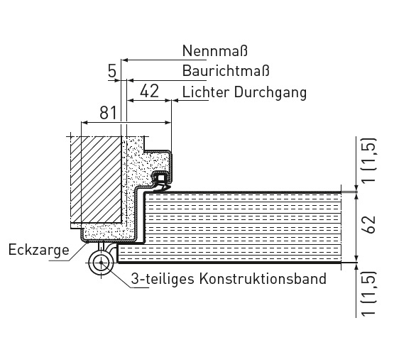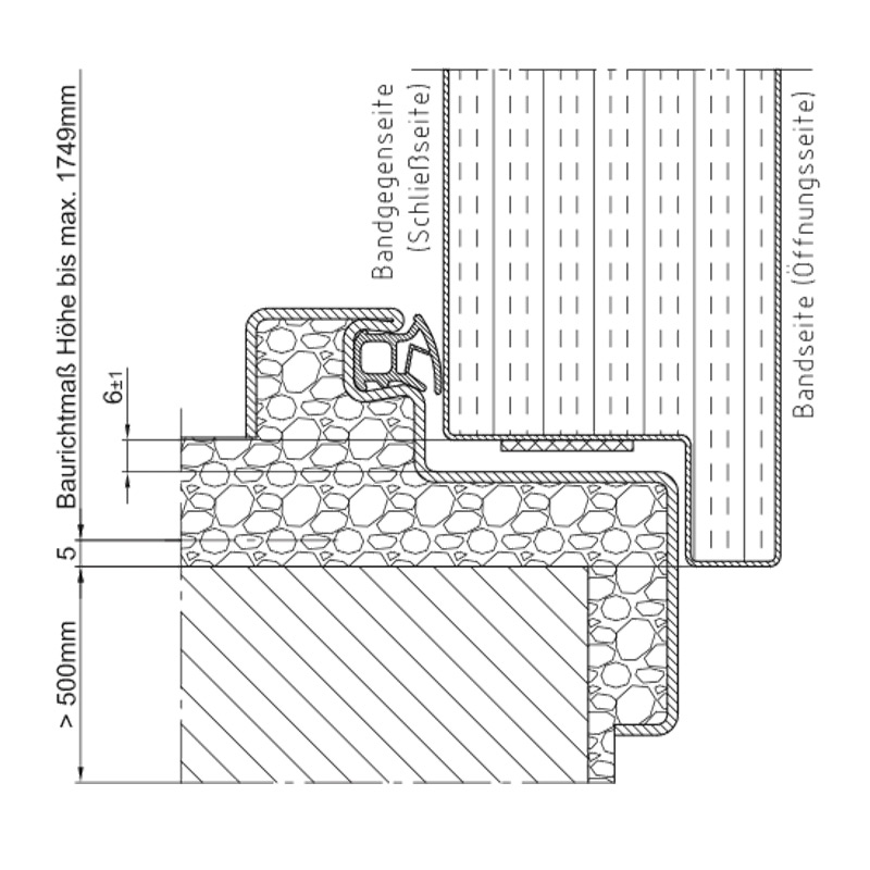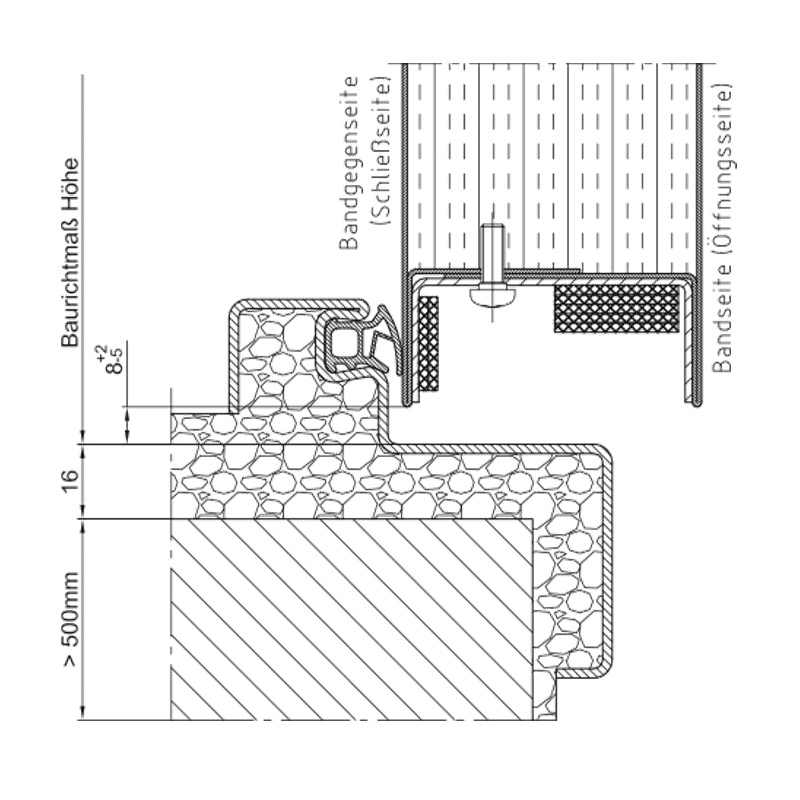 Стандартно: Ъглова каса с тристранен уплътнителен профил CR без удължение за вкопаване в пода, дебелина на касата 2,0 мм, широчина на лицевата страна 50 мм, опция: обхватна каса, 2140B двусъставен обхватен профил, насрещна каса и блок каса за захващане към стената.