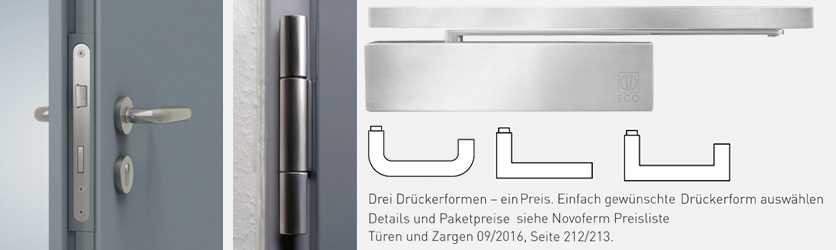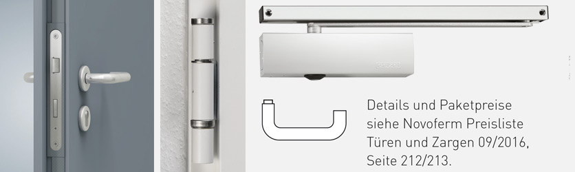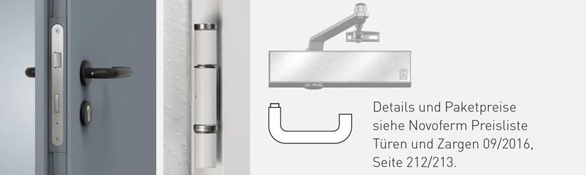 3-съставни панти, стандартно оборудвани със сачмени лагери. По две панти на крило: стандартно грундирани в бяло, подобно на RAL 9016, като опция се предлагат от неръждаема стомана, като регулируеми 3D панти от стомана или неръждаема стомана, или като тънки 3D панти от неръждаема стомана. Два осигурителни шипа на крило до поръчкова височина 2125 мм (размери на светлия проход 2083 мм), три осигурителни шипа при височини от 2126 мм (размери на светлия проход 2084 мм). В стандартна версия с автомат Geze TS 4000F или dormakaba TS 89 F, която се предлага на същата цена и с автомат с направляваща шина Novoferm NFGS 55) Вградена брава с изтеглящ се език, с черен комплект заоблени дръжки (монтиран е патрон с врътка). Патрон за монтаж на място за интериорните врати (дължина 85 мм, 35/50 мм). За външни врати под формата на глух патрон, включен в обхвата на доставката.