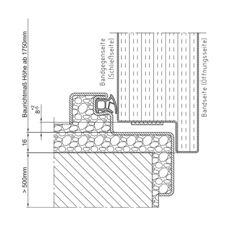 - Крило на вратата с фалц с дебелина 64 мм от трите страни, дебелина на ламарината 1,0 мм (по избор 1,5 мм)