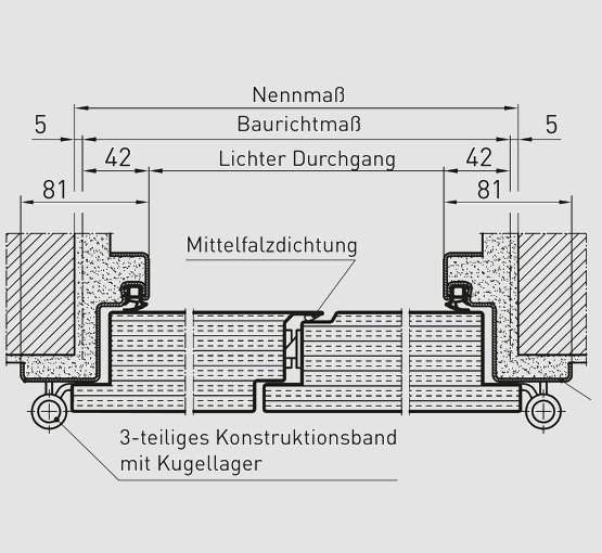 - за 2-крили врати с поръчков размер до 2500 x 2500 mm (размер на свободния проход 2416 x 2458 mm) 35 dB RwP