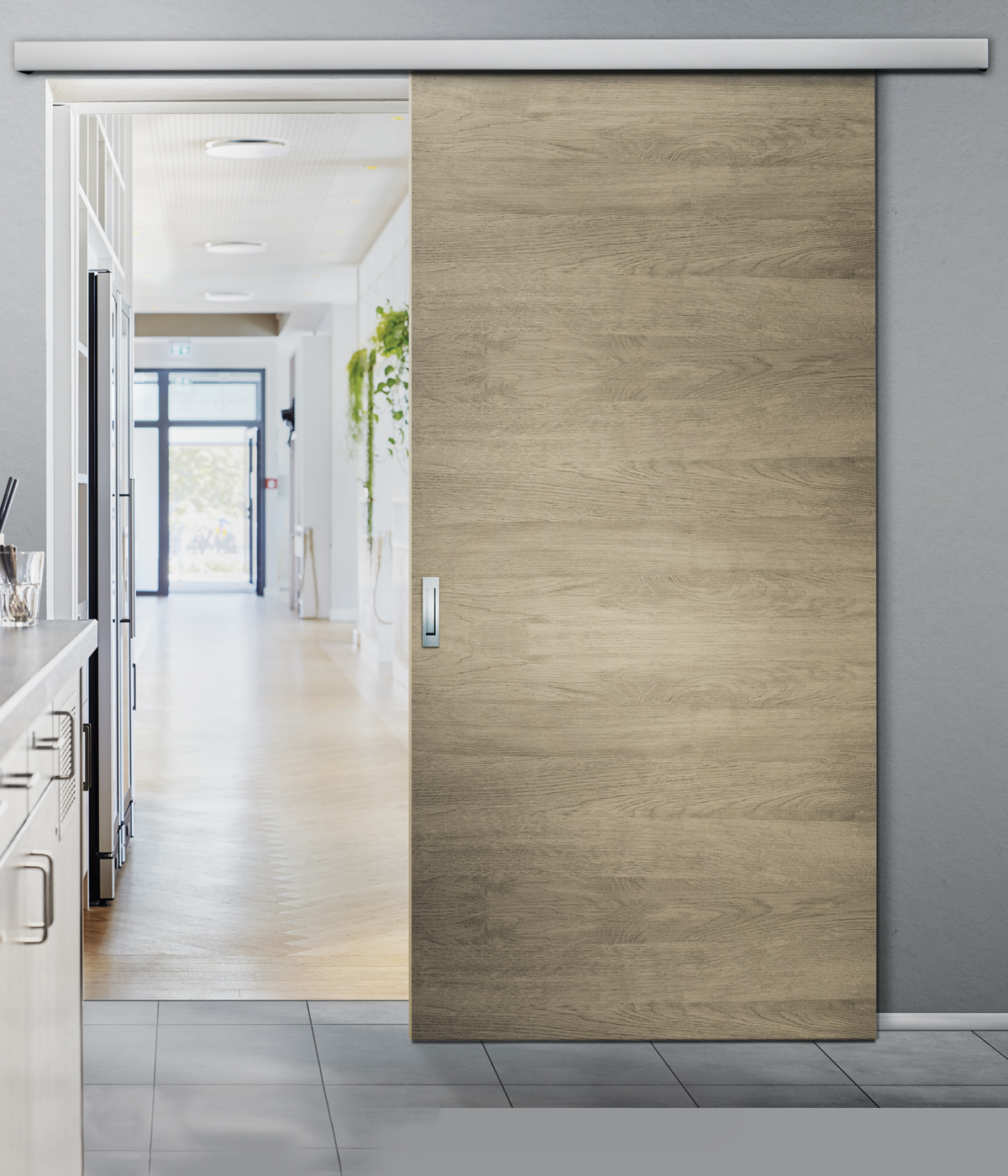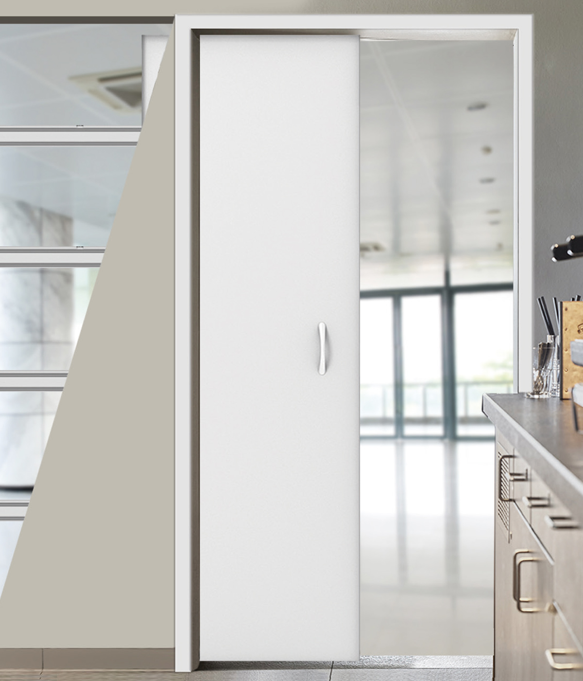 Системата за плъзгащи се врати е предназначена за монтаж в гипсокартонени стени и се предлага със стандартни ширини на крилото от 610 мм до 1235 мм.