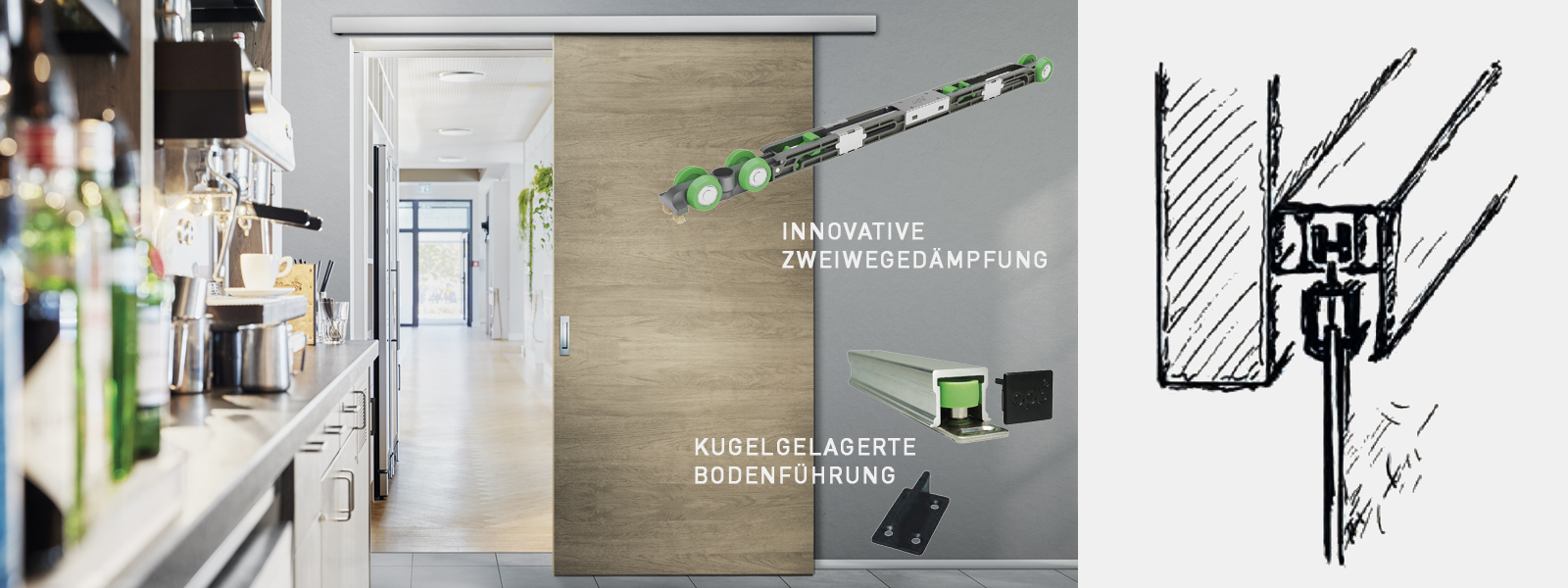 Комплектът ролки винаги включва двустранно демпфериране до тегло на крилото на вратата 80 kg за ширина на крилото на вратата от 610 mm. Позицията за паркиране на вратата се постига чрез просто позициониране на активиращите елементи в ходовата част и може да се монтира и допълнително. Вградените обозначения върху всички надлъжни профили улесняват настройката спрямо готовия под.