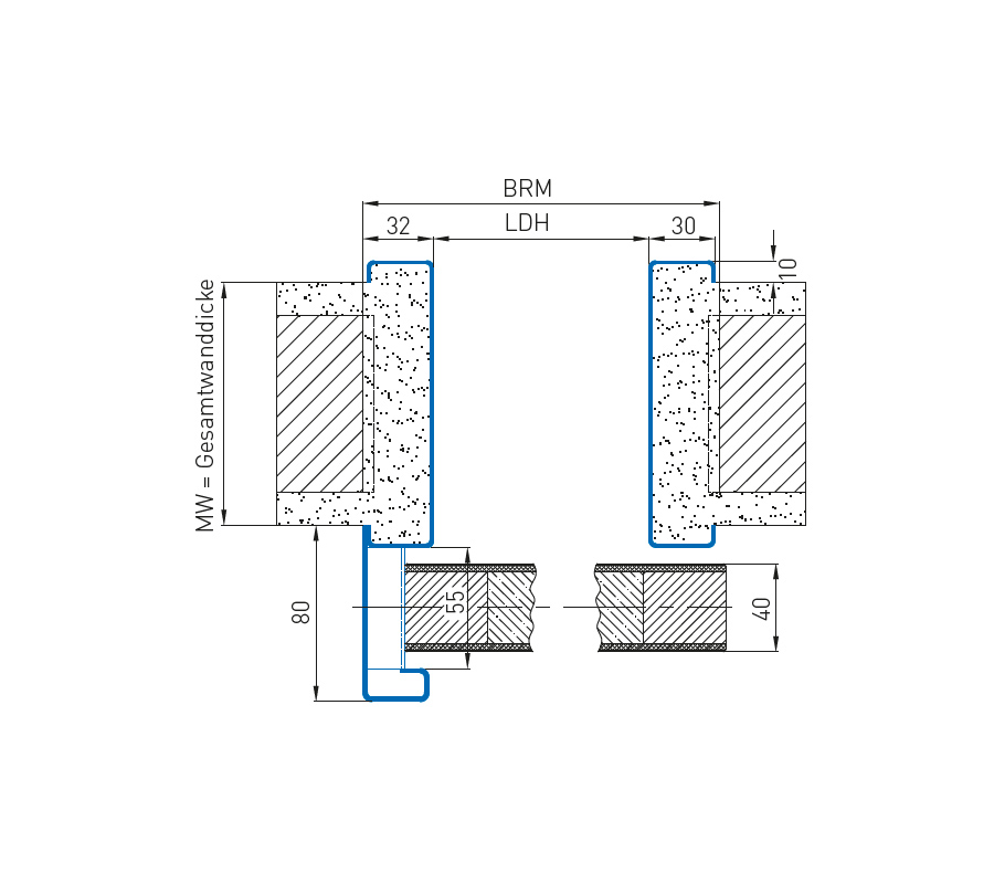 - Обхватна каса със ограничителен панел, еднокомпонентна за масивни стени или вграждане в стена от гипсокартон или двукомпонентна при модернизация и монтаж в гипсокартонени стени или зидария