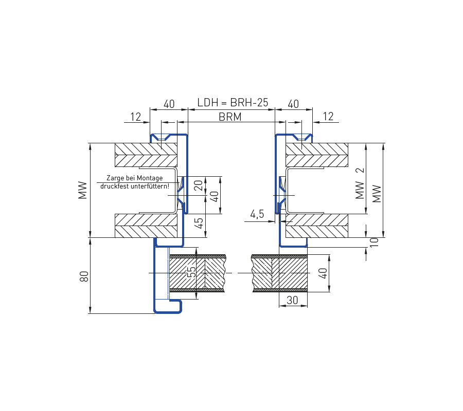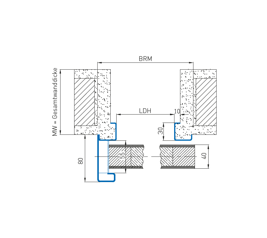 - с двукомпонентна стоманена каса, заварена или разглобена, поцинкована и грундирана, или по желание монтирана в отвора на стената от гипсокартон (показана тук), ширината на отвора е скосена за изцяло стъклените крила на вратите