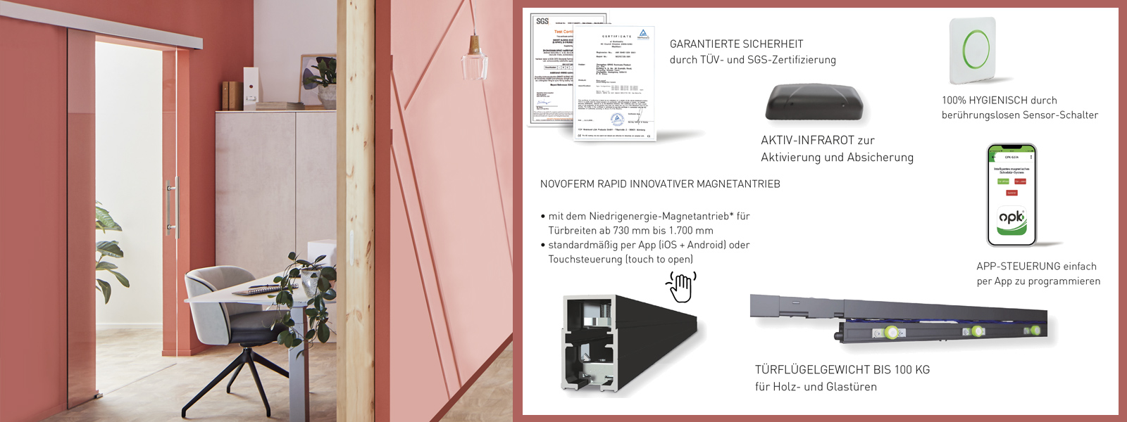 Системата за плъзгащи се врати NovoSlide Pocket се монтира безпроблемно в отвора на стената. Състояща се от изработена по мярка метална кутия, здрава алуминиева релса с комплект обков за дървени или изцяло стъклени врати за поставяне на място и опция за стоманена рамка, тя дава максимална свобода за създаване на оригинални разпределения на помещенията. По този начин NovoSlide Pocket се вписва отлично както в частните домове, така и в търговски сгради.
