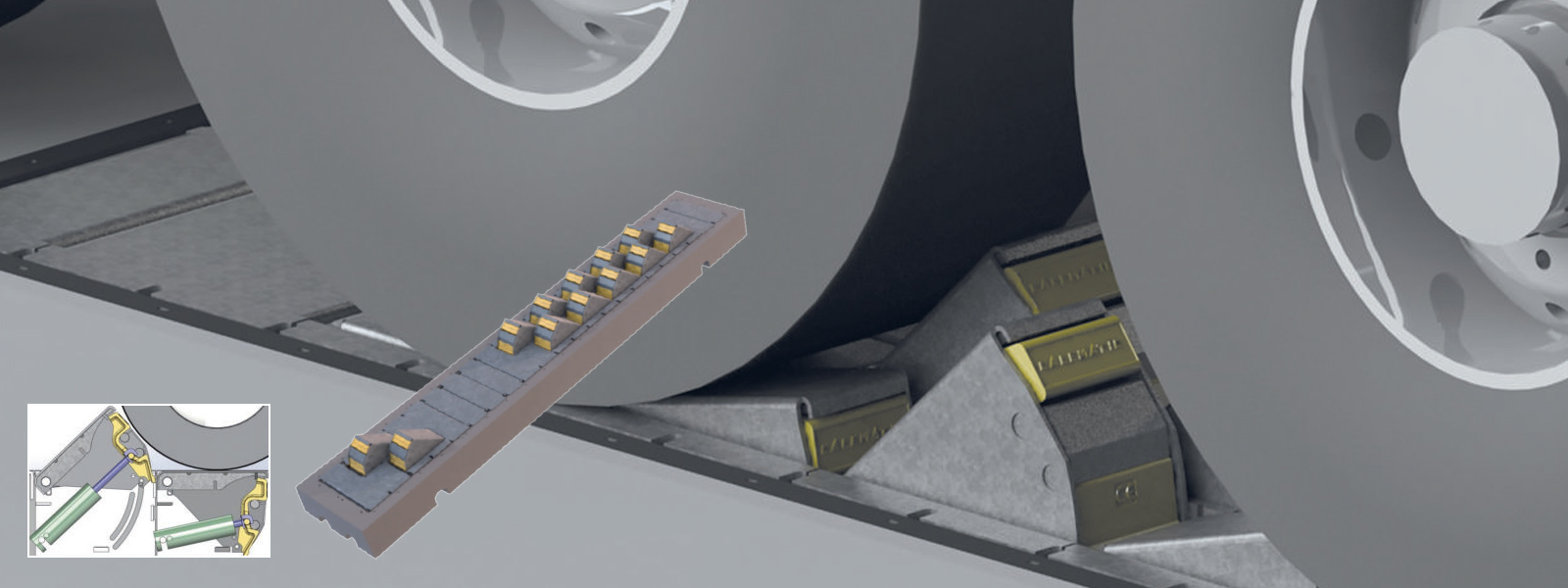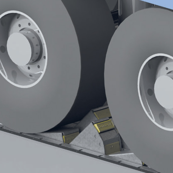 Deshalb werden elektronische Radkeile mit Verbindung zum Tor und zur Ladebrücke eingesetzt. Die Ladebrücke kann erst bedient werden, wenn der Radkeil am Rad anliegt. Ein Lagesensor im Radkeil gewährleistet die korrekte Anwendung.