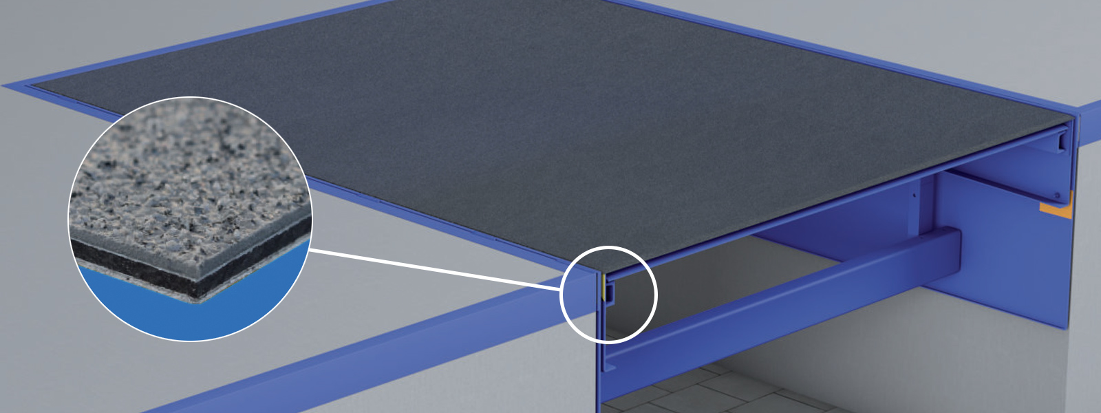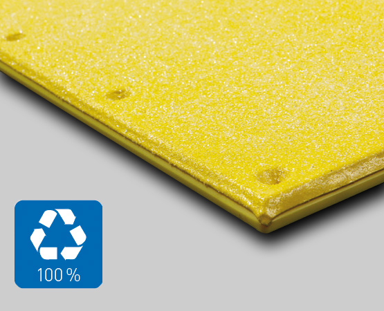 | • Massive Lärmreduktion bis zu 85 % (25 dB) zur Verbesserung des Arbeitsschutzes, geprüft durch TÜV Rheinland | • Hohe Rutschsicherheit (R12), geprüft durch Berufsgenossenschaft nach DIN |