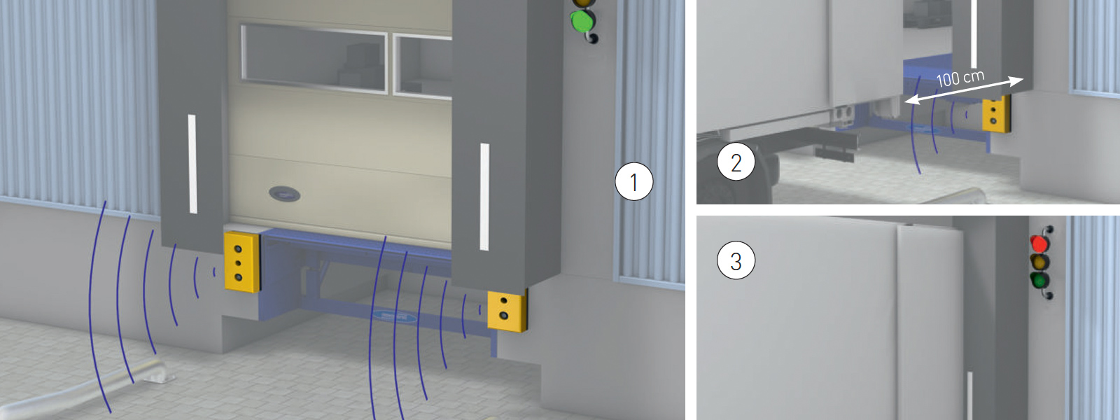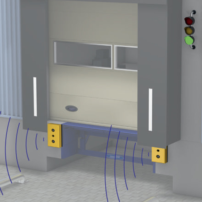 | • Anfahrpuffer aus Hochleistungskunststoff in signalgelb | • Entfernungsmessung (LKW–Gebäude) mit Anzeige über Außenampel |