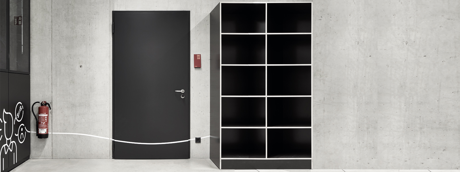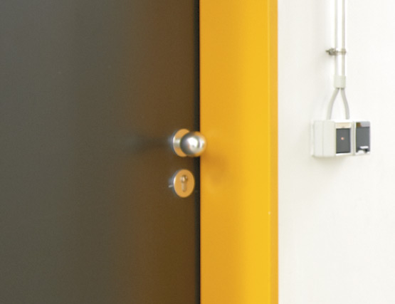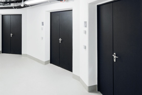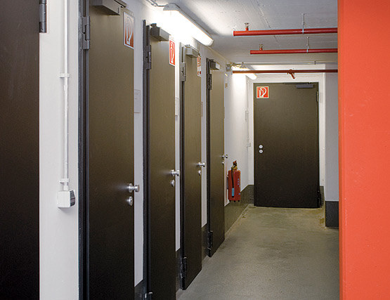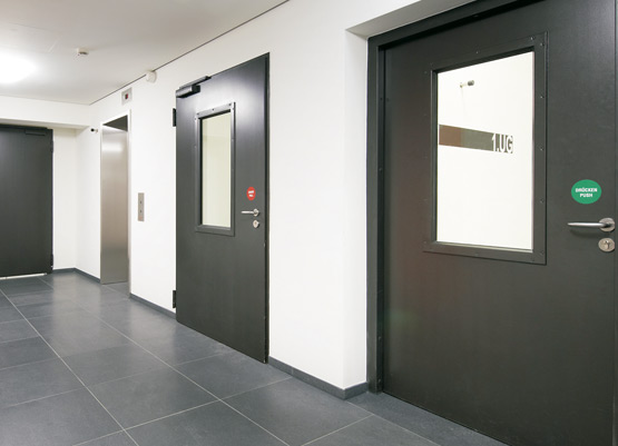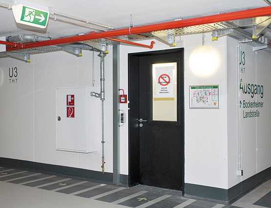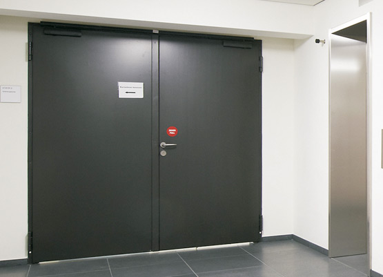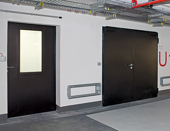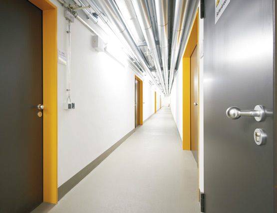 Еднокрилите и двукрилите противопожарни врати от Т30 и Т90, както и многофункционалните врати от стоманена ламарина надеждно защитават това крило с високо ниво на безопасност от огън и дим, а също така затрудняват достъпа на неоторизирани лица. Рамките, боядисани в яркожълто, оживяват външния вид.