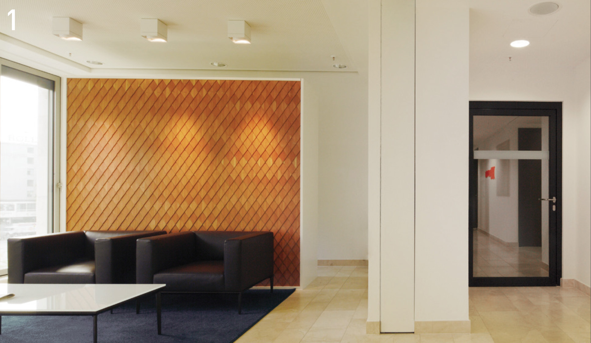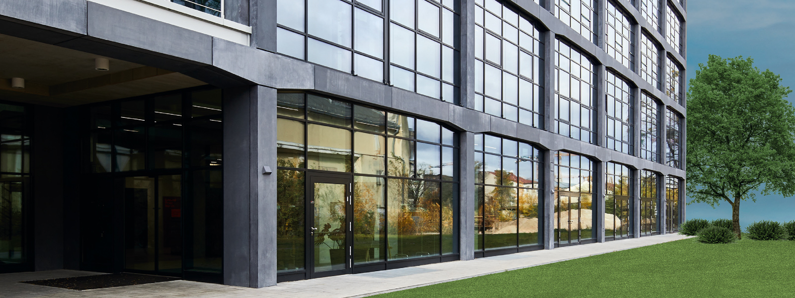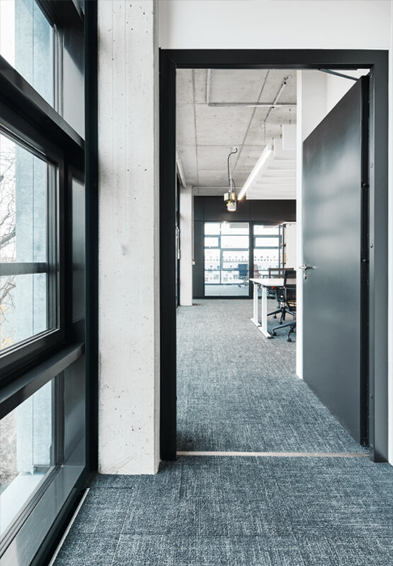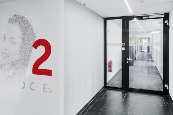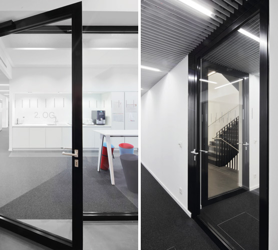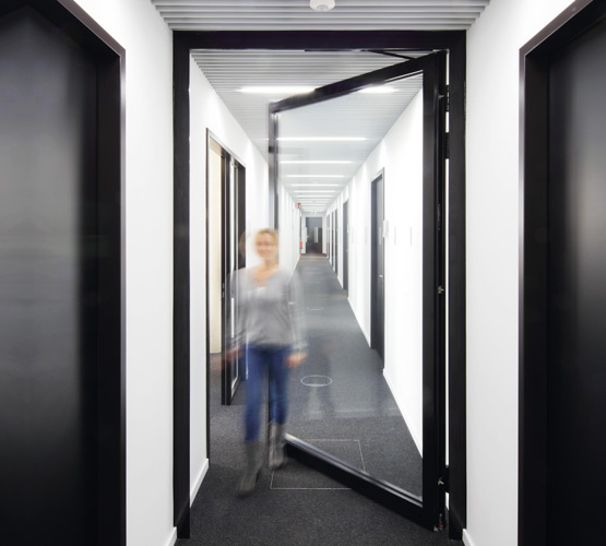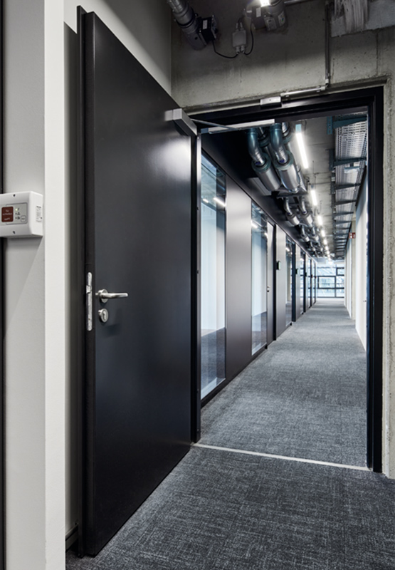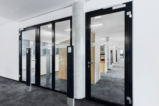 В крайна сметка за видимата работна зона беше избрана компанията Novoferm с персонализирани решения за врати с тръбна рамка от серията NovoFire®; освен това във функционалните зони на сутерена бяха използвани пожарозащитни врати от серията NovoPorta Premio, някои от които с изрязани стъкла. За клиента беше важно вратите да се вписват в архитектурата във всяко отношение - сградата с отворен план, която е предназначена за комуникация и общуване, не трябва да бъде видимо сегментирана от противопожарни врати.