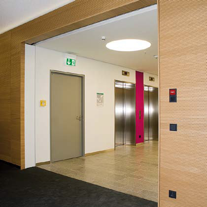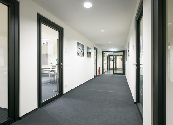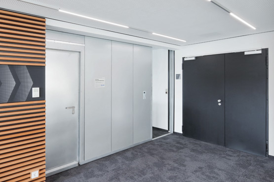 За тази цел вратите тук са специално пригодени със звукоизолация. В случай на пожар допълнителната защита от дим, вградена в невралгичните точки, и контролираните затварящи механизми с вградена функция за задържане на отворените врати осигуряват максимална безопасност за служителите, посетителите и участниците в семинара.