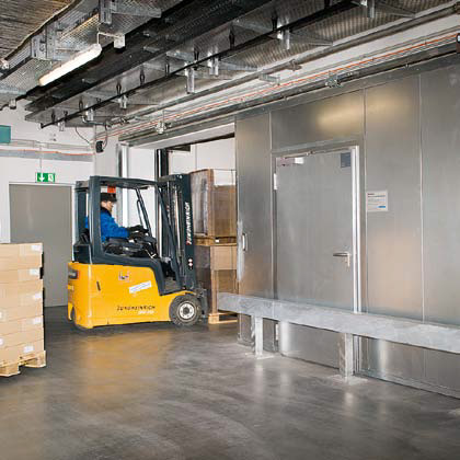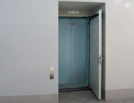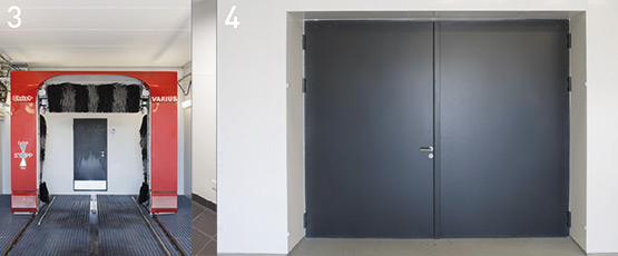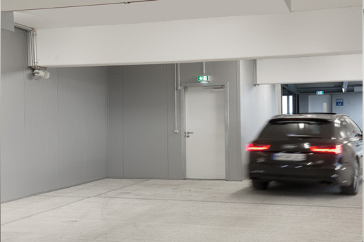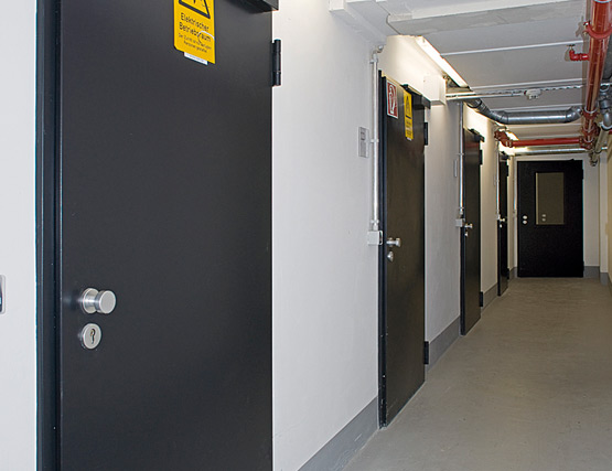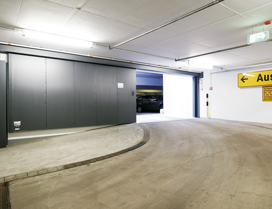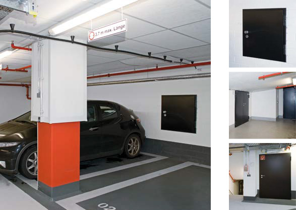 Отделните врати от листова стомана в сутерена също са оборудвани с моторизирано задвижване, за да се осигури достъп до сградата без бариери.