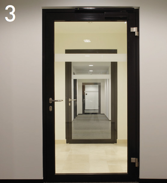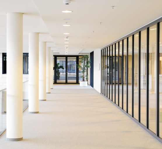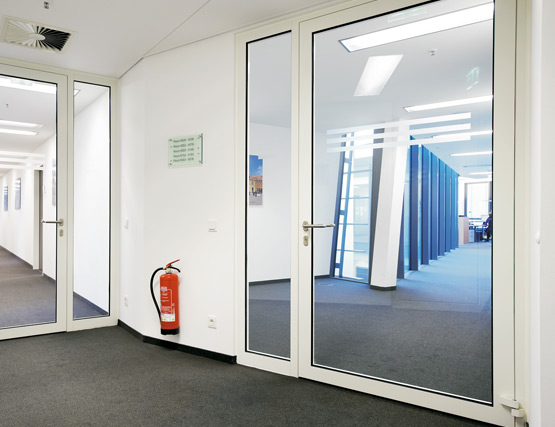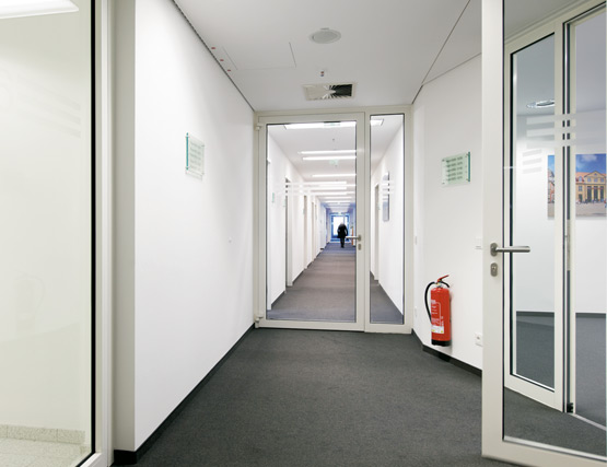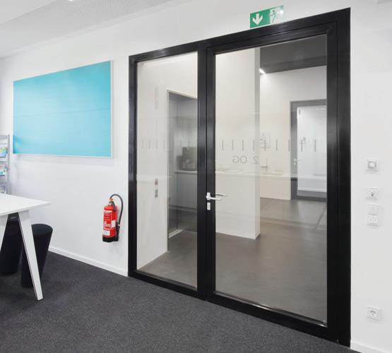 Всъщност почти няма следи от противопожарна защита в обществените и офисните помещения. Това стана възможно благодарение на използването на врати с алуминиева тръбна рамка Novoferm от серията NovoFire® в различни размери и с различни характеристики. Техните тесни профили и големи стъклени повърхности осигуряват прозрачност и високо ниво на сигурност.