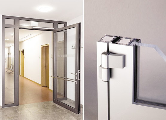 Откритостта се създава, наред с другото, и от ширината, поради което Novoferm трябваше да изработи врати "с големи размери": Еднокрилите врати са с размери 1,50 x 2,60 м, а някои от тях са допълнени с остъклени странични панели. Оцветяването и качеството на повърхността на тръбните рамкови конструкции съответстват точно на външния вид на другите елементи на сградата: Въпреки това един много специален детайл ги прави особено ценни: лаковото покритие на всички алуминиеви врати с тръбна рамка е съобразено с цвета на външната фасада. Това повишава разпознаваемостта и подсилва единния външен вид.