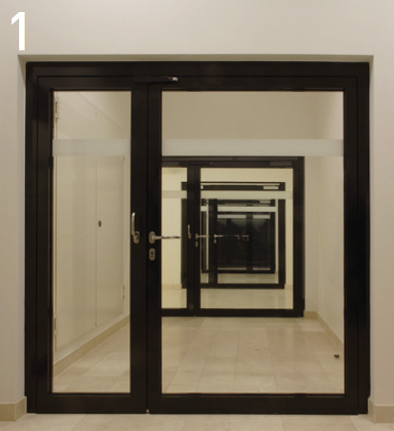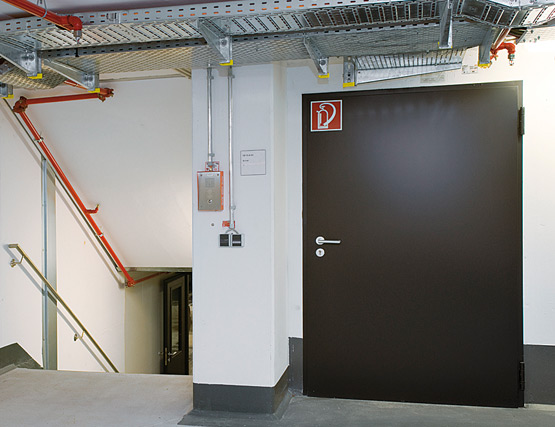 Освен това бяха използвани 155 еднокрили и двукрили пожарозащитни и многофункционални врати от серията NovoPorta Premio . Стоманените врати T30, T90 и MZ обезопасяват функционалните и техническите зони на всяко ниво на сградата, особено в сутерена.