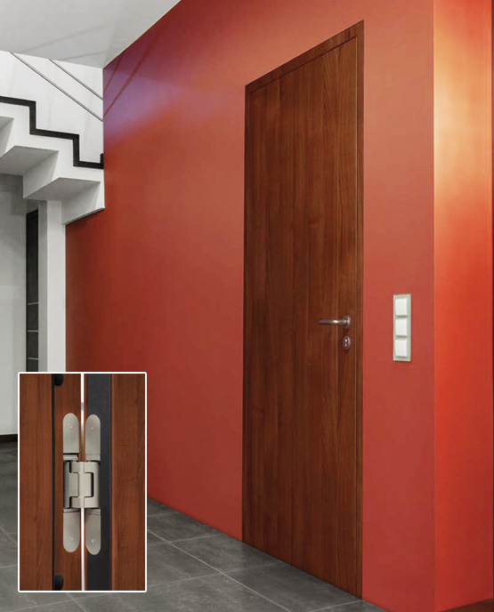 | Дизайнерски многофункционални врати от серията Plano за висококачествена хотелска архитектура с тъп фалц, тънки 3D панти, вградена централна панта за двукрили врати и атрактивен обков |