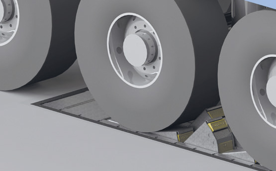 | Електронна система за сблъсък NovoEASY с колесен клин; док нивелирът може да се задейства само когато колесният клин е в контакт с колелото и камионът е надеждно осигурен срещу неволно преобръщане |