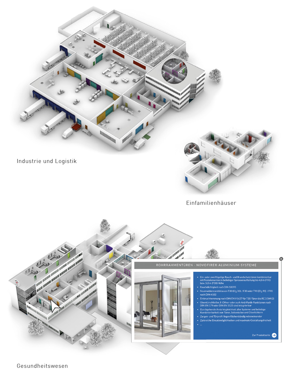 Diese ganzheitlichen Lösungen veranschaulichen wir in visuell aufbereiteten 3D-Gebäuden unter Berücksichtigung der Anforderungen für Brandschutz, Rauchschutz, Lärmschutz oder Sicherheit.