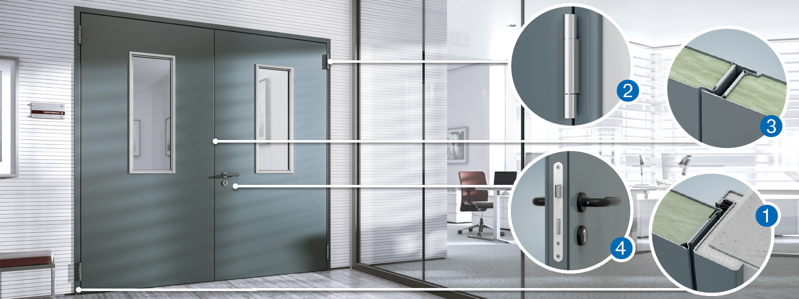 - Vielseitige und hochkonfigurierbare Objekttüren in Dickfalz- oder flächenbündiger Ausführung, erhältlich in den Brandschutzklassen EI2 30, EI2 60 und EI2 90, mit zahlreichen Funktionsausstattungen