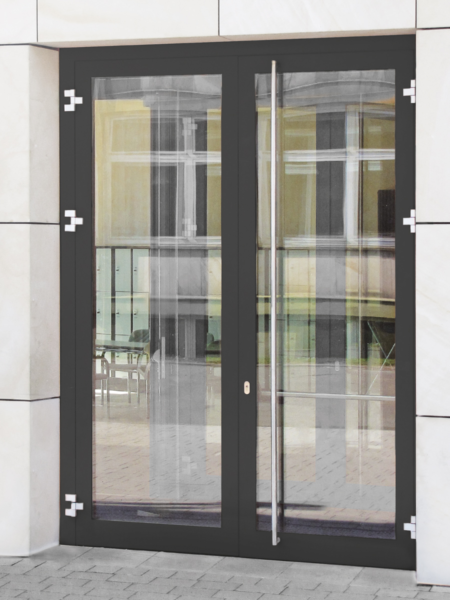 - Weitaufschwingende zweiflügelige, automatisierte Aluminium-Türelemente mit großzügigen Glasflächen