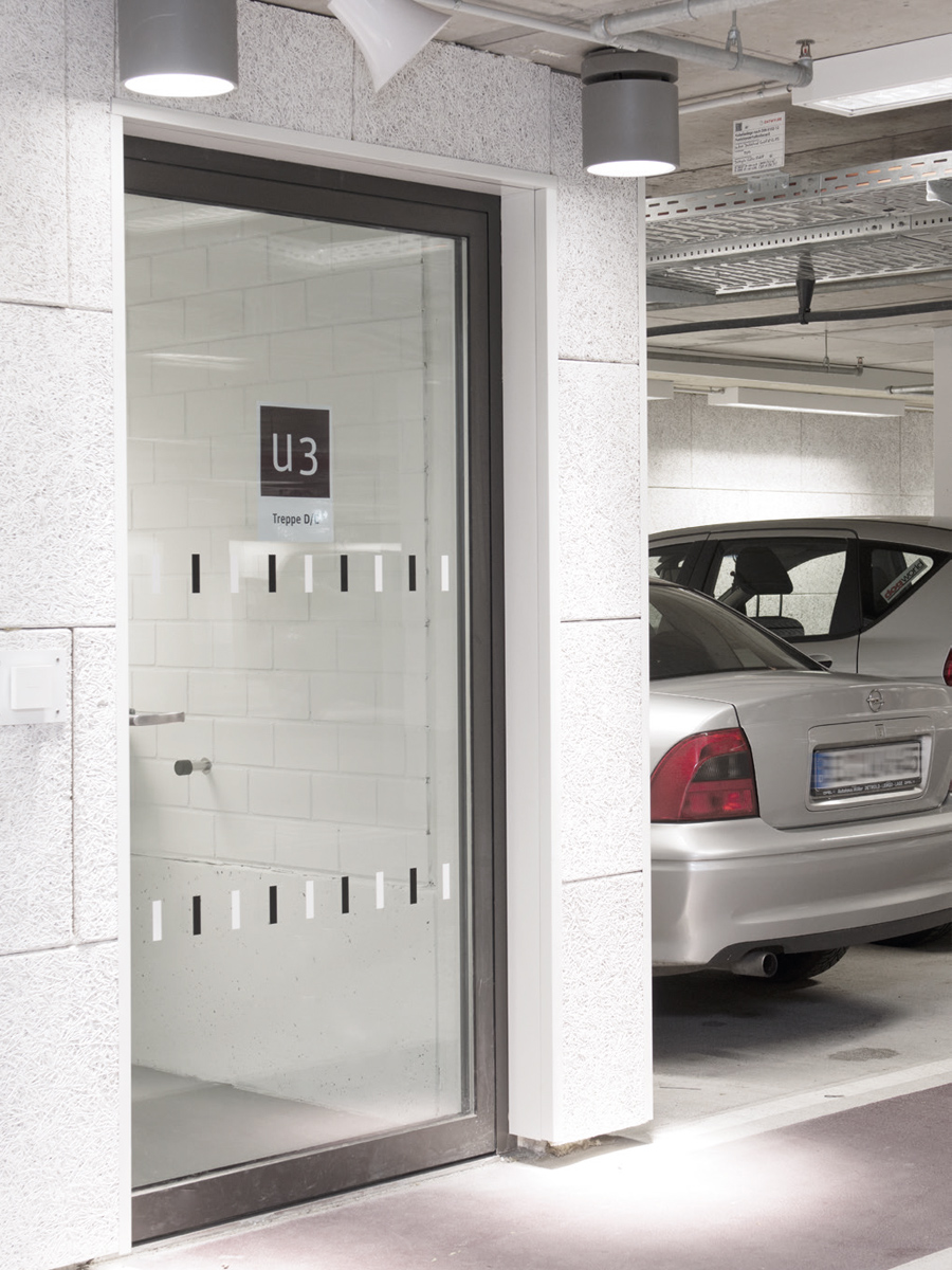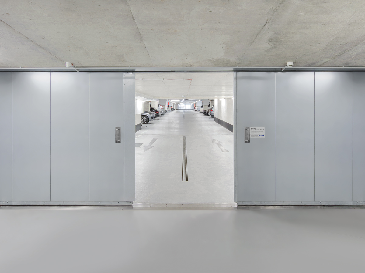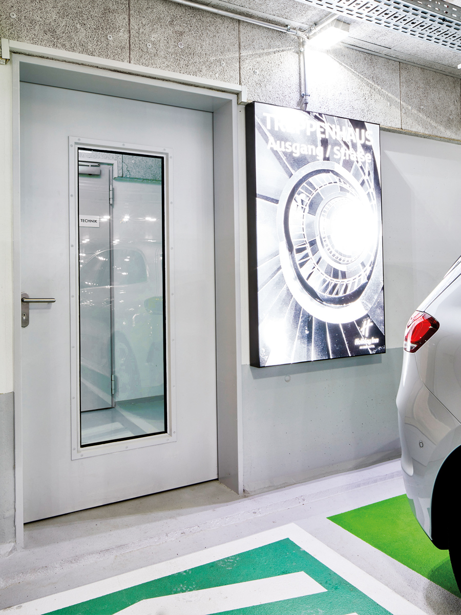 Im Untergeschoss sorgt u.a. eine beidseitig mit NovoPorta Premio Türen ausgerüstete Schleusensituation für optimalen Brandschutz. Die verglaste Zugangstür zur Tiefgarage verfügt über einen Drehflügelantrieb mit Sicherheitssensorik und ist ebenfalls barrierefrei.