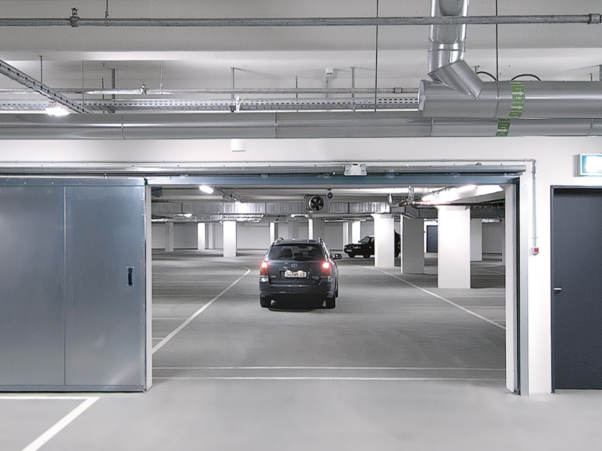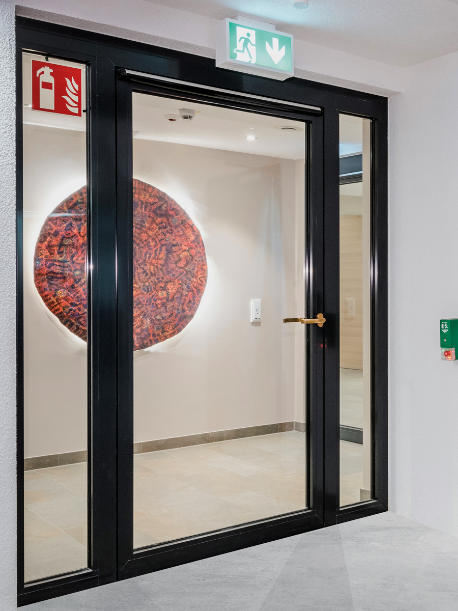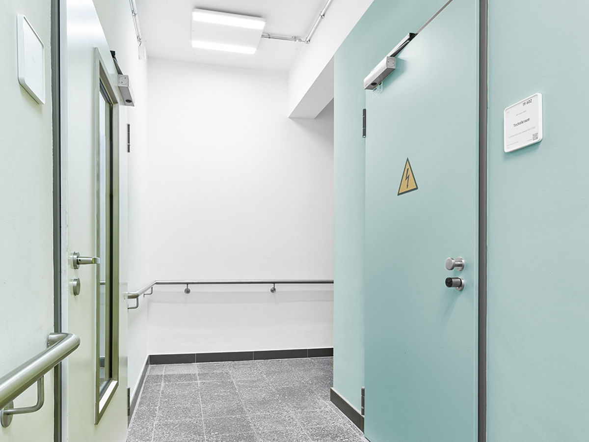 Im Untergeschoss sorgt u.a. eine beidseitig mit NovoPorta Premio Türen ausgerüstete Schleusensituation für optimalen Brandschutz. Die verglaste Zugangstür zur Tiefgarage verfügt über einen Drehflügelantrieb mit Sicherheitssensorik und ist ebenfalls barrierefrei.