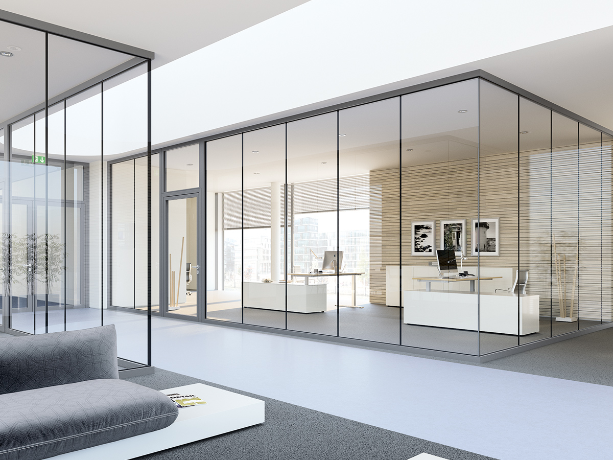 Rohrrahmentüren aus Glas oder Metall in den Ausführungen EI2 30 und EI2 90 sowie Ganzglaswände für transparente Raumerlebnisse in Büros.