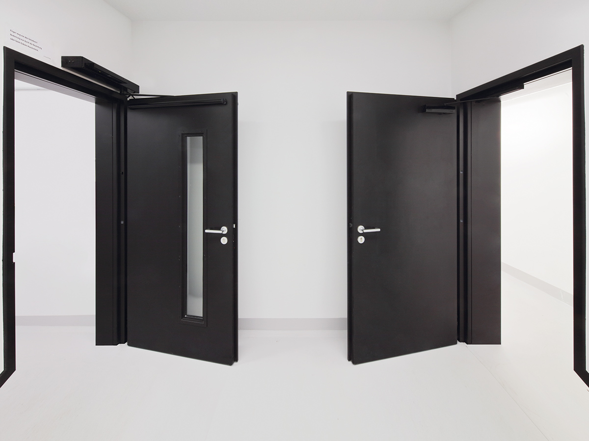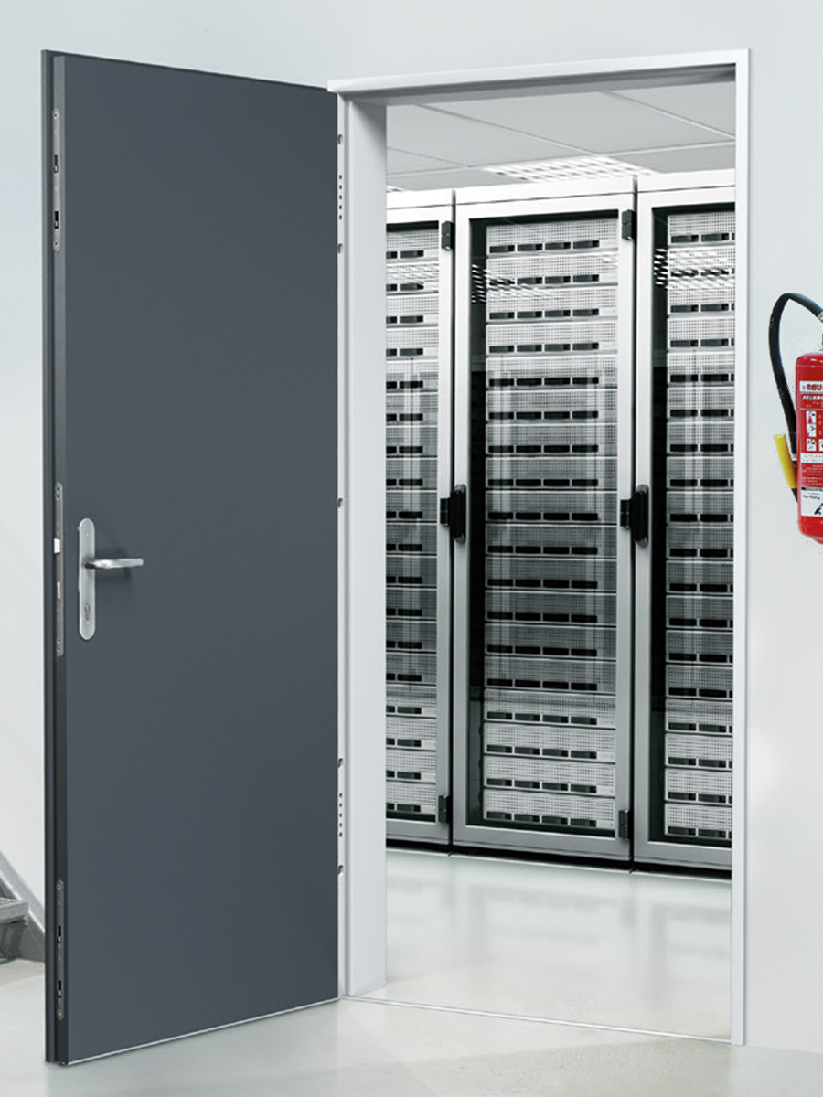 - Stahl-Sicherheitstüren mit verschiedenen Verriegelungsvarianten, mit Fluchtwegesicherung über integrierte Fluchttür-Verriegelung, gekoppelt mit Türterminals, Alarmfunktionen und Gebäudetechnik