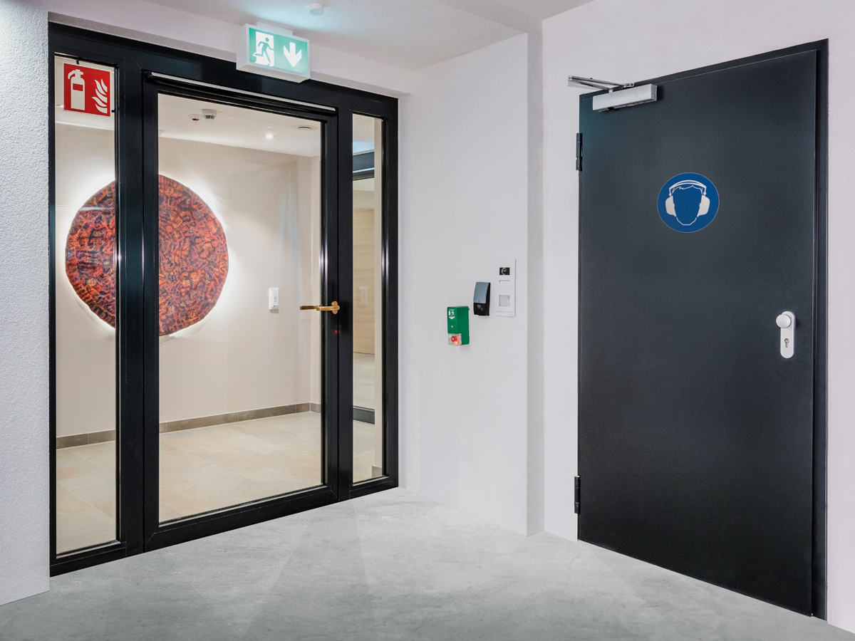 Linke Tür Premio Schallschutztür DB-1 Typ 50 als schwellenloser Zugang zum Technikbereich mit Schallfunktion 50 dB und digitaler Zugangskontrolle.